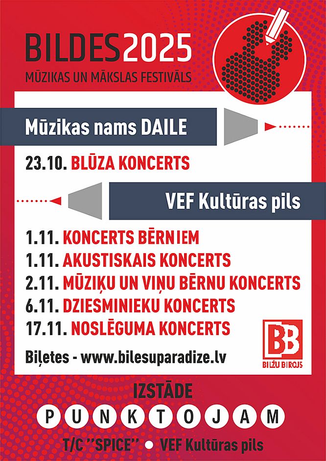 Šoruden, kā ierasts, notiks tradicionālais mūzikas un mākslas festivāls “Bildes”. To rīko SIA “Bilžu birojs”. Festivāla trīsdesmit sestajā pastāvēšanas gadā notiks seši koncerti, turklāt pirmo reizi – arī akustiskais koncerts. No 8. oktobra līdz 8. novembrim tirdzniecības centra “Spice” otrajā stāvā, kā arī 17. novembrī VEF Kultūras pilī būs apskatāma mūziķu un mākslinieku veidota izstāde “Punktojam!”. Koncerti sāksies 23. oktobrī un norisināsies līdz 17. novembrim mūzikas namā “Daile” un VEF Kultūras pilī, pulcējot visdažādāko žanru un vecumu mūziķus un visu paaudžu klausītājus. Festivāla “Bildes 2025” logo autors ir mākslinieks Uldis Baltutis, kurš veidojis “Bilžu” logo visus festivāla pastāvēšanas gadus.