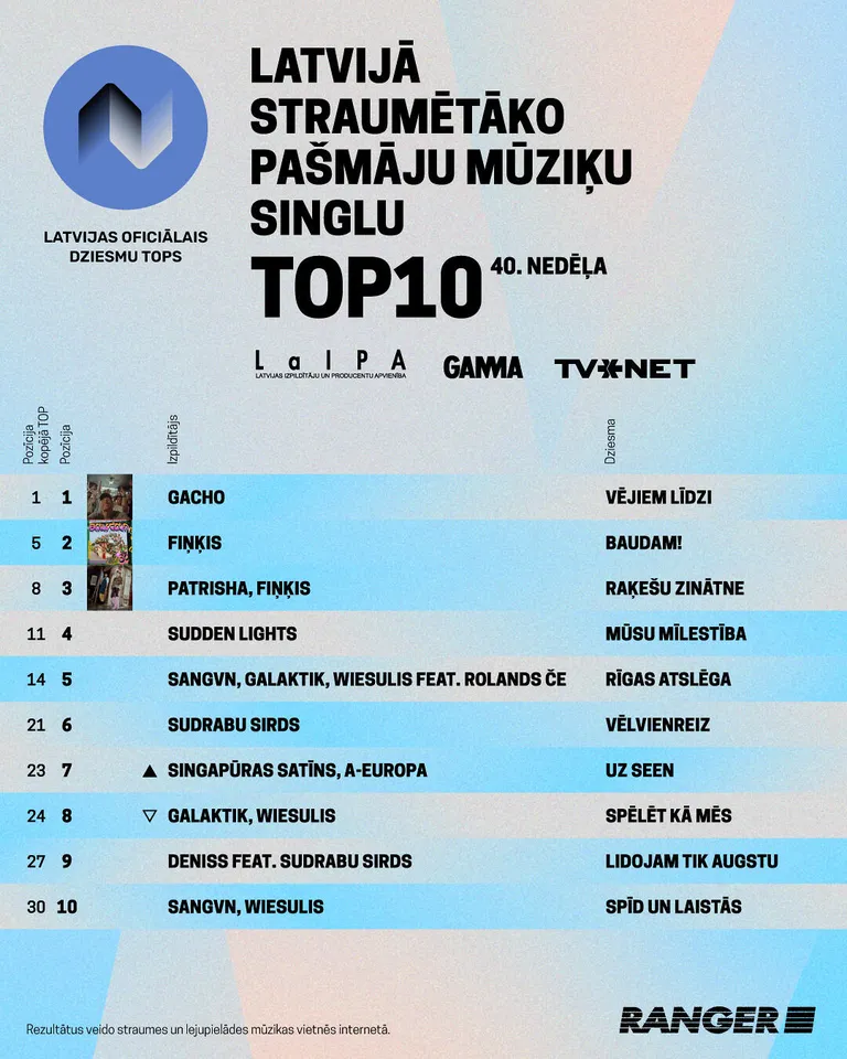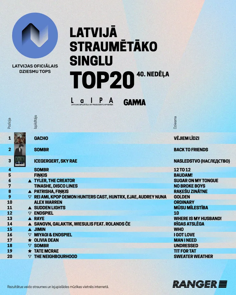 Latvijas straumēšanas TOP 20 trijnieks saglabājies nemainīgs – pirmajā vietā ir reperis Gacho ar dziesmu “Vējiem līdzi” – topā tā ir jau septīto nedēļu. Otrais ir amerikāņu popmūziķis sombr ar hitu “back to friends”, savukārt trešajā pozīcijā ir repera Icegergert un dziedātājas SKY RAE dziesma “Наследство” (Mantojums).