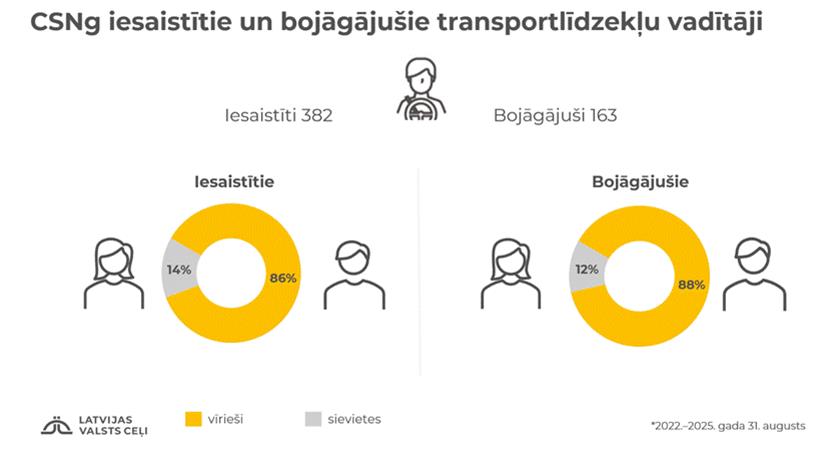 Ceļu satiksmes negadījumos ar bojāgājušajiem uz valsts autoceļiem laikā no 2022. līdz 2025. gada augusta beigām bija iesaistīti 378 transportlīdzekļu vadītāji, no tiem 163 gāja bojā. Starp iesaistītajiem transportlīdzekļu vadītājiem 86% bija vīrieši, 14% – sievietes. Starp bojāgājušajiem transportlīdzekļu vadītājiem 88% jeb 144 bojāgājušie bija vīrieši, bet 12% jeb 19 bojāgājušie bija sievietes.