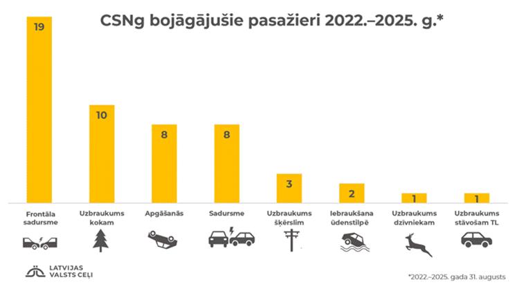 Laika periodā no 2022. līdz 2025. gada augusta beigām ceļu satiksmes negadījumos ar bojāgājušajiem uz valsts autoceļiem bija iesaistīti 239 pasažieri, no tiem 52 gāja bojā. Pārsvarā pasažieri gājuši bojā frontālās sadursmēs.