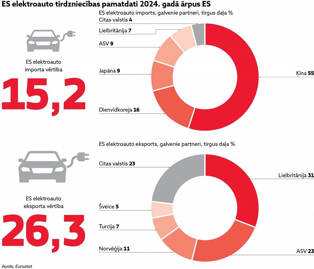 Neilgi pirms tarifu ieviešanas Eiropas Savienības lielākā elektroauto un hibrīdauto importa partnere 2024. gadā bija Ķīna, kas ieveda 55% no 15,2 miljardu eiro vērtās elektroauto importa tirgus daļas, liecina Eurostat dati.