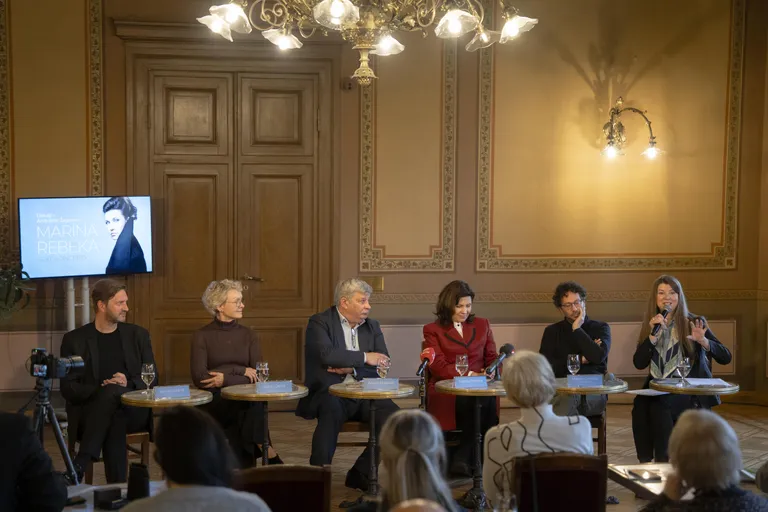 Diriģents Mikēle Gamba un preses konferences tulkotāja Hella Milbreta Holma. Foto: Marko Rass