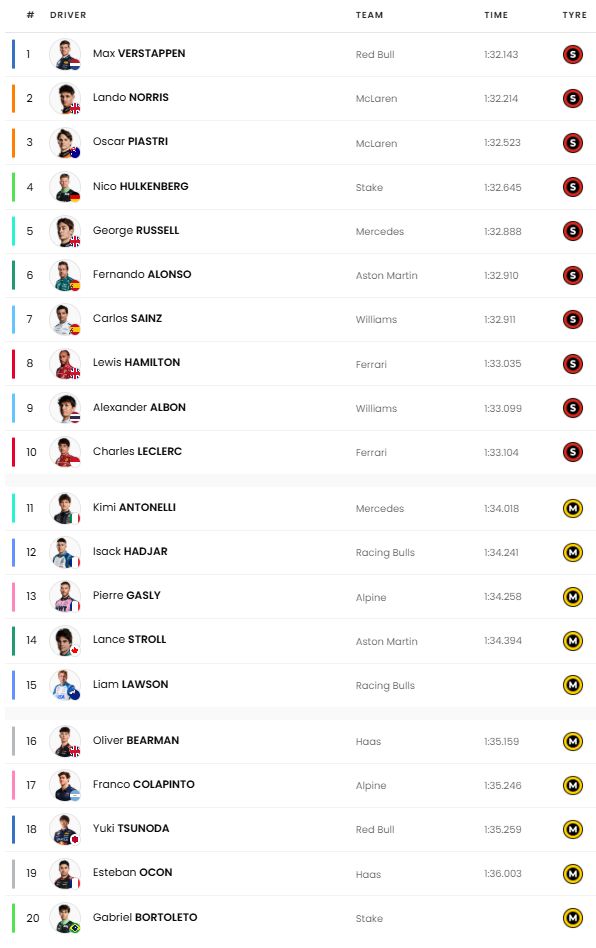 Aiz viņa piektajā vietā ierindojās “Mercedes” braucējs Džordžs Rasels, bet sesto pozīciju izcīnīja “Aston Martin” pilots Fernando Alonso. Karloss Saincs (“Williams”) ieņēma septīto vietu pēc pārnesumkārbas problēmām brīvajos treniņos, kas viņam pirms kvalifikācijas ļāva nobraukt vien deviņus apļus.