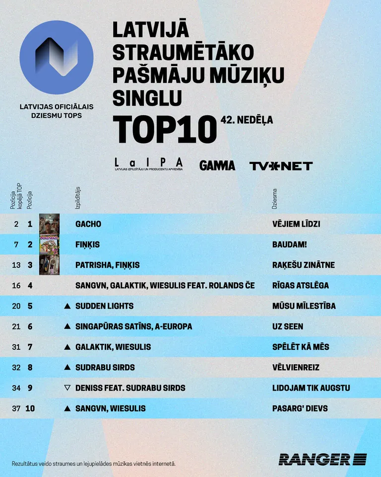No latviešu singliem Fiņķis ar “Baudam!” ierindojies septītajā vietā, bet Fiņķa un Partishas hits “Raķešu zinātne” ir 13. vietā. Reperu Wiesuļa un rolanda če, producentu sangvn un galaktik kopā radītā dziesma “Rīgas atslēga” ir 16. vietā. “Sudden Lights” kaverversija “Čikāgas piecīšu” dziesmai “Mūsu mīlestība” ieņem 20. vietu.