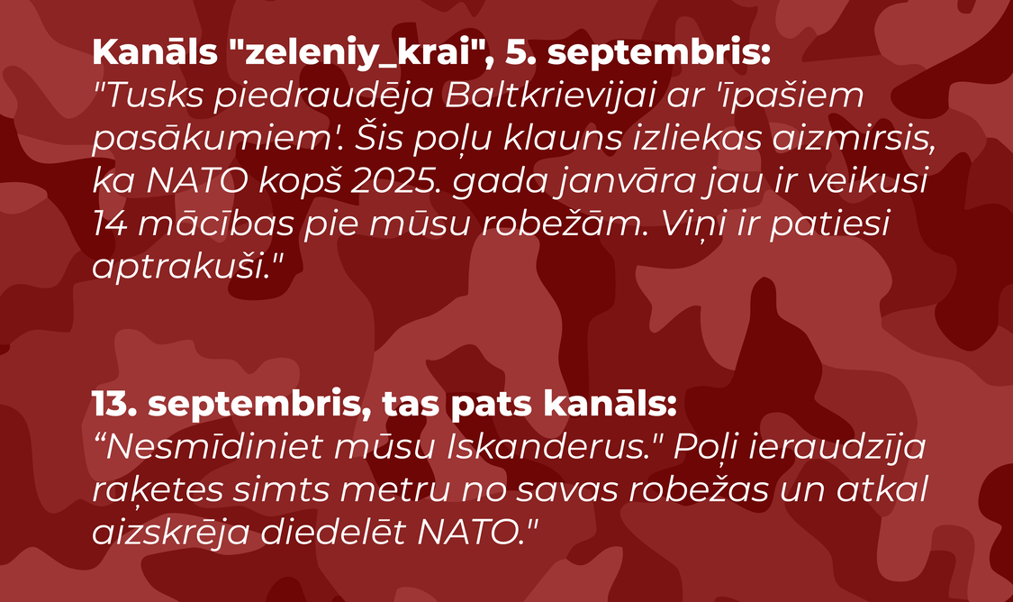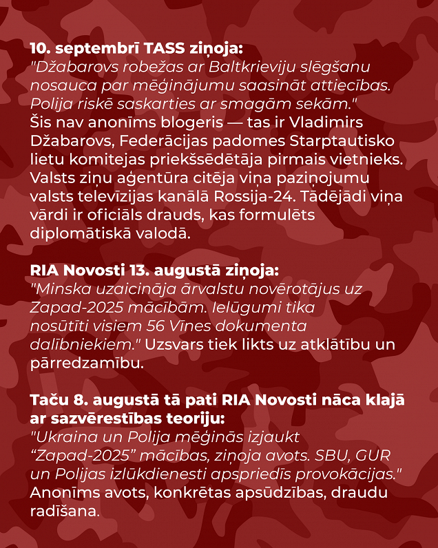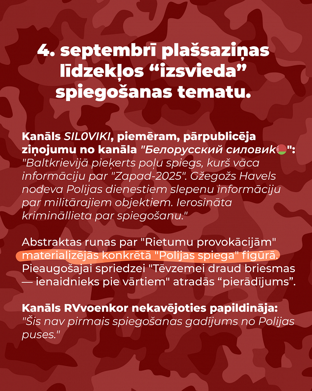 12. septembra pusnaktī Polija drošības apsvērumu dēļ slēdza robežu ar Baltkrieviju militāro mācību laikā. Šis lēmums izraisīja sašutuma vilni Krievijas medijos un “Telegram” platformā. Krievijas mediji konstruēja naratīvu: Polija slēdz robežu un ir panikā; pulcē karaspēku un gatavo provokāciju; vaino Krieviju, bet rīkojas pēc NATO pavēles.