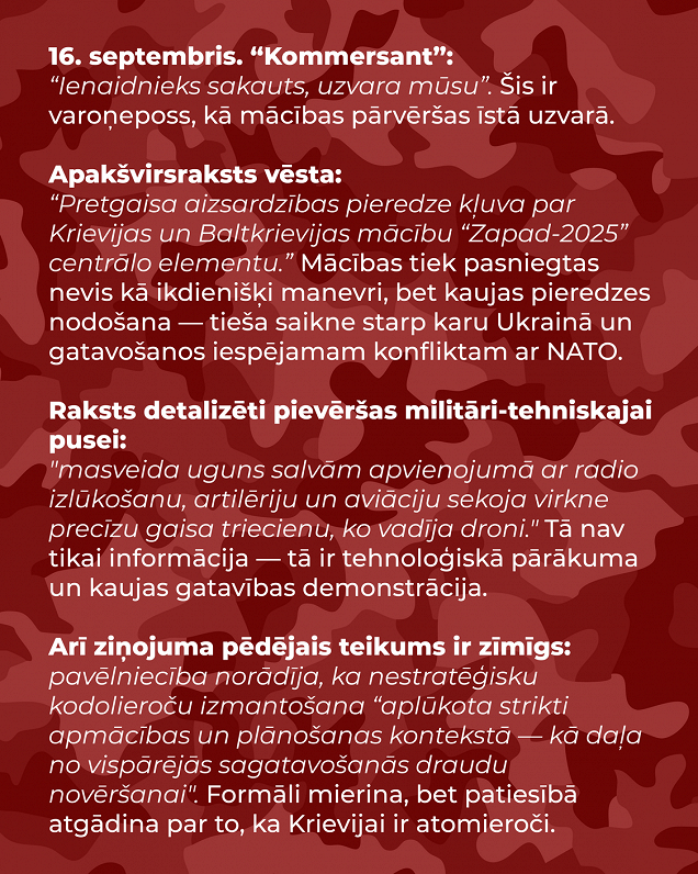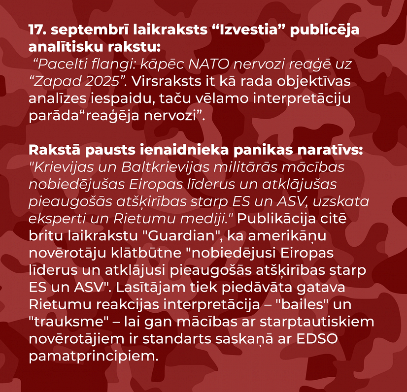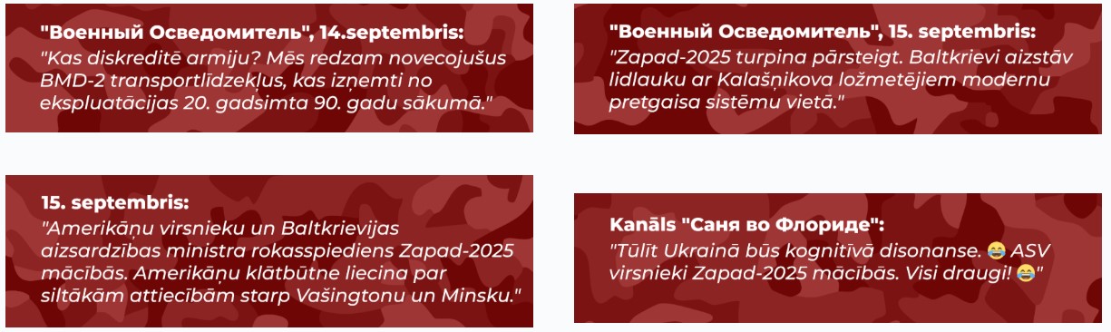 Lai noskaidrotu Krievijā izplatītos naratīvus par mācībām “Zapad-2025”, ko mediji nodeva miljonu auditorijai, “Media IQ” sadarbībā ar “Re:Baltica” analizēja to atspoguļojumu Krievijas plašsaziņas līdzekļos un “Telegram” kanālos no 2025. gada 1. līdz 16. septembrim. Izpēte aptvēra ziņu aģentūru materiālus (TASS, “RIA Novosti”, “Interfax”), drukāto presi (“Izvestia”, “Kommersant”, “Vedomosti”, RBC), ar aizsardzības resoru saistīto Zvezda TV kanālu un vairāk nekā 55 “Telegram” kanālu — no oficiāliem līdz atklāti radikāliem.