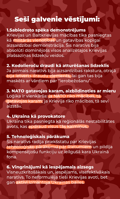 - Galvenie vēstījumi: kodolatturēšana, NATO kā agresors, Ukraina kā provokatore, Krievijas tehnoloģiskais pārākums.