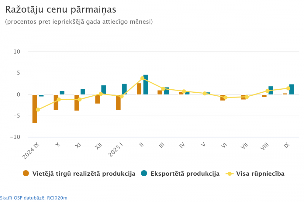 Vietējā tirgū realizētajai produkcijai cenu līmenis 2025. gada septembrī, salīdzinot ar 2024. gada septembri, palielinājās par 0,3 %, eksportētajai produkcijai – par 2,4 %. Eksportam uz eirozonas valstīm cenas pieauga par 2,4 %, eksportam uz valstīm ārpus eirozonas – par 2,3 %.