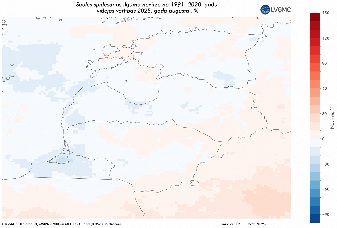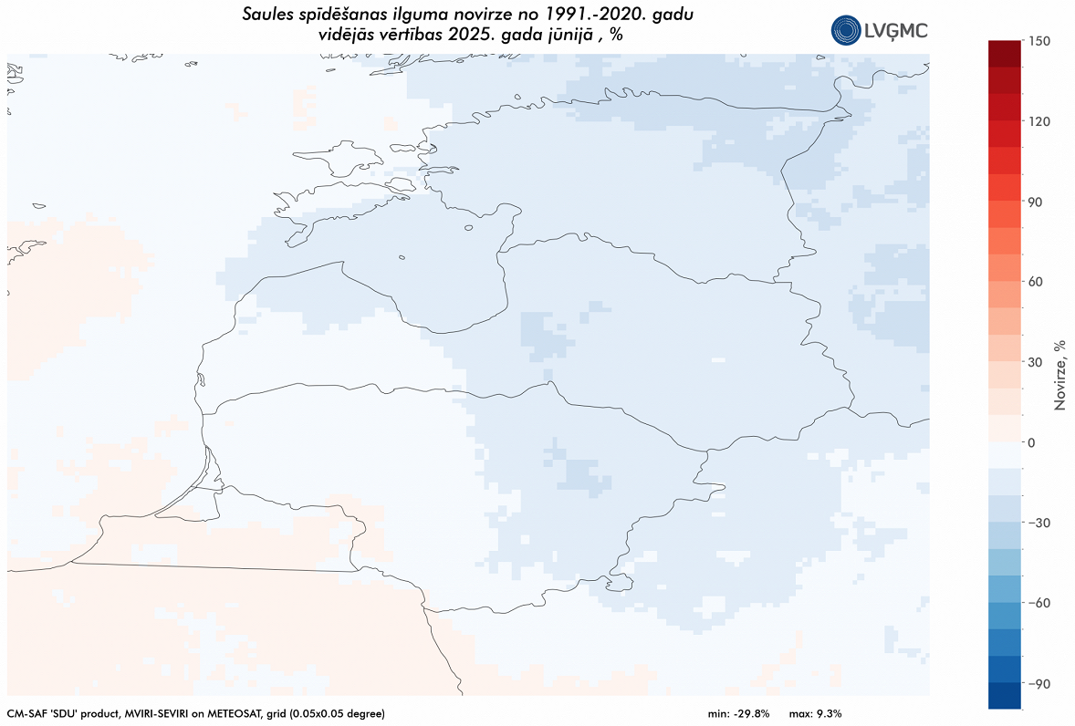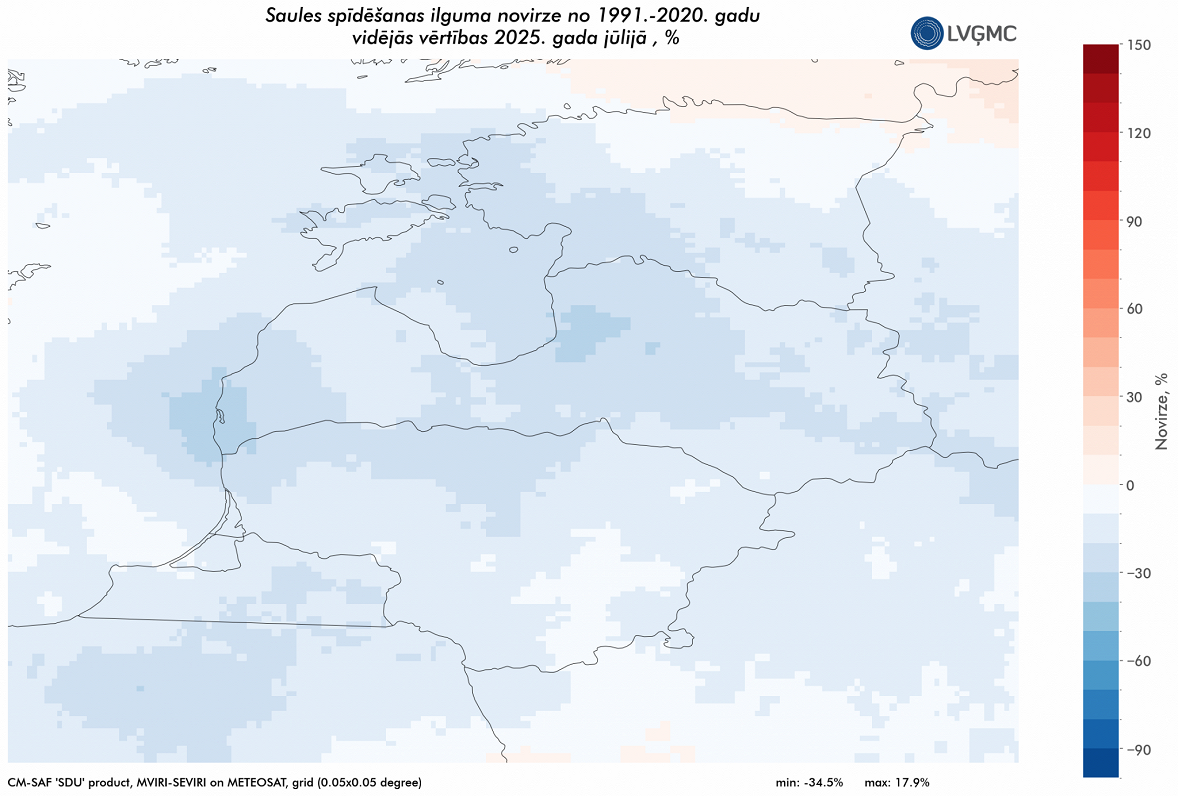 Tiem augļiem un ogām, kas salnas pārcieta un sāka briest, vajadzēja sauli, bet tās bija maz. Latvijas Vides, ģeoloģijas un meteoroloģijas centrs ik mēnesi publicē datus no satelītinstrumentiem, cik daudz saules bijis, un tie rāda, ka jūnijā Kurzemē saules spīdēšanas ilgums bija tikai par dažiem procentiem mazāks par normu, bet Zemgalē, Vidzemē un Latgalē – pat par 10-30% mazāk saules. Jūlijā visā valstī saules spīdēšanas ilgums bija 10–30% zem normas, bet Vidzemes un Kurzemes rietumos pat par 50% mazāks nekā normālos jūlijos. Augusts kaut nedaudz centās kompensēt – Vidzemē un Latgalē saules daudzums bija ap normu, bet Zemgalē un Kurzemē vienalga par 5–15% mazāk nekā norma.