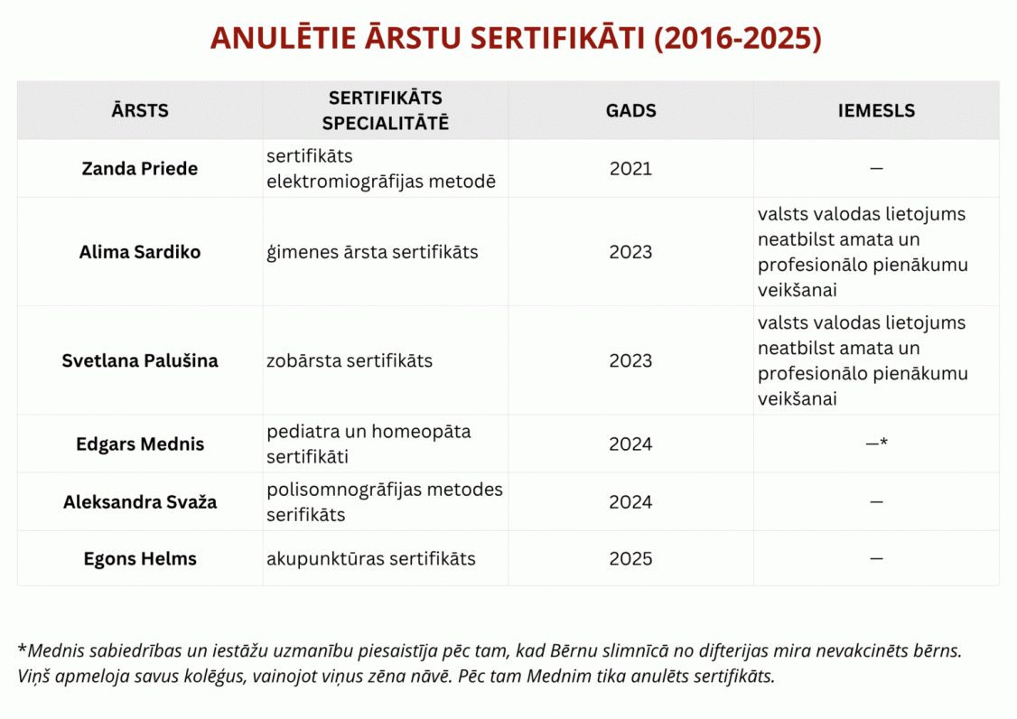 Slimnīcas vadītāja uzsvēra, ka uzticas Latvijas Ārstu biedrības (LĀB) sertifikācijas komisijai. Tur reizi piecos gados vairāki speciālisti izvērtē, vai ārsts atbilst amatam.