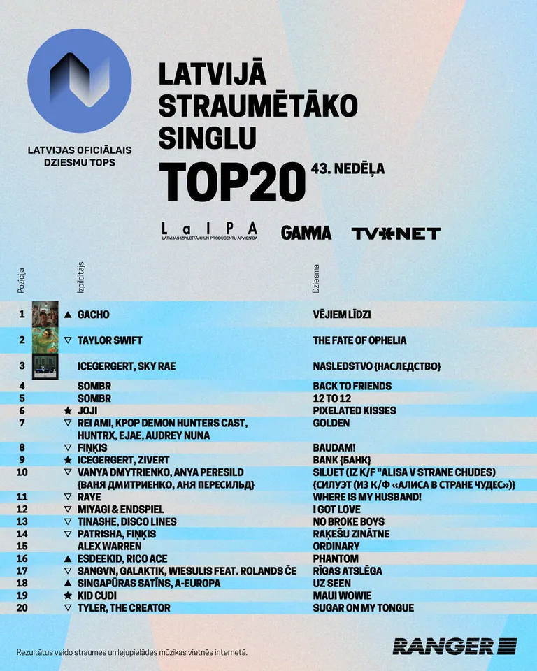 Latvijas straumēšanas top20 virsotnē ir repera GACHO singls “Vējiem līdzi”.