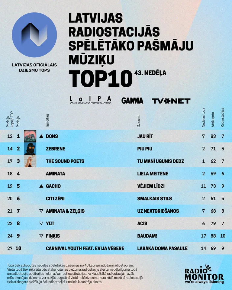 Top 20 savu vietu atradušas arī sešas pašmāju dziesmas. Visaugstāk topā, 12. vietā ir dziedātāja Dona singls “Jau rīt”. ZeBrenes dziesma “Piu Piu” ir 14. vietā.