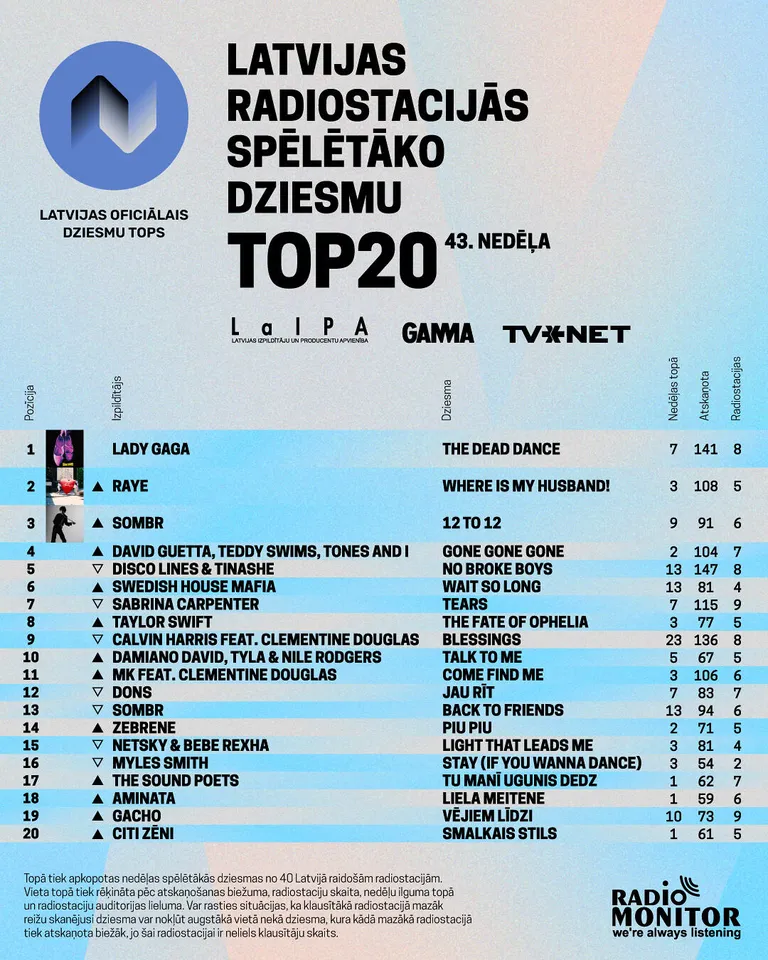 Latvijas radiostacijās joprojām spēlētākā ir Lady Gaga jaunā dziesma “The Dead Dance” – topa pirmajā vietā tā ir septiņas nedēļas. Dziedātājas RAYE ekspresīvais singls “Where Is My Husband!” ieņem otro pozīciju, bet popmūziķa sombr dziesma “12 To 12” ir trešajā vietā.