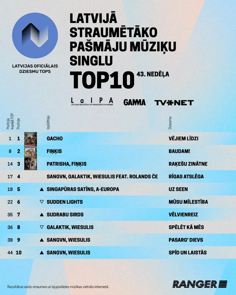 Reperu Wiesuļa un rolanda če, producentu sangvn un galaktik kopā radītā dziesma “Rīgas atslēga” ir 17. vietā. Tikmēr “Singapūras satīns” un “A-Europa” kopdarbs “Uz seen” ir 18. vietā.