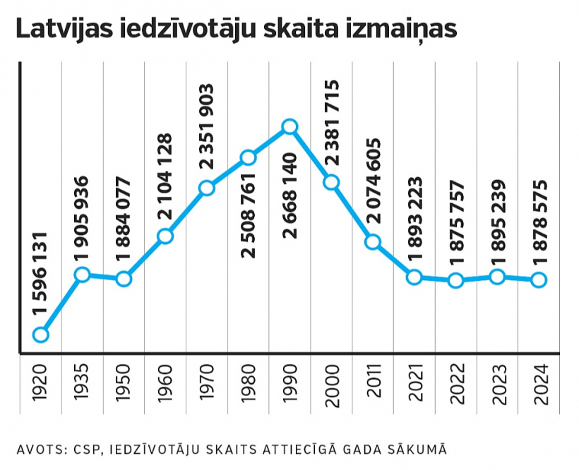 Kaut Alvja Hermaņa sacītais, ka “600 Ainažu iedzīvotāji nesen pārvākušies uz Somiju”, ir ļoti apšaubāms fakts, tomēr viņa paustās bažas par to, ka Latvija slīgst demogrāfiskā bedrē, ir pamatotas un nav arī nekas jauns… Šā gada sākumā Latvijā kopumā bija 1 860 565 iedzīvotāji, – liecina CSP dati. Tas ir par nepilniem 50 tūkstošiem cilvēku jeb gandrīz par veselu Jelgavu mazāk nekā 2020. gadā. Dabiskā pieauguma rādītājs pēdējos piecos gados (2020.–2024.) valstī nokrities zem mīnus 70 tūkstošiem. Šīs vasaras jūlijs bija pirmais mēnesis kopš 2024. gada oktobra, kad Latvijā piedzimuši vairāk nekā tūkstotis bērnu (reģistrēti 1103 jaundzimušie). Pērn oktobrī tika reģistrēti 1020 dzimušie, bet turpmākajos mēnešos jaundzimušo skaits nesasniedza tūkstoti.
