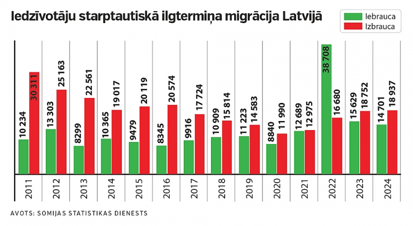 Migrācijas saldo pēdējos piecos gados kopumā bijis pozitīvs – plus 11 233. Taču jāņem vērā, ka to pamatā ietekmējis 2022. gada imigrācijas vilnis (ieradās daudz Ukrainas bēgļu), un turpmākajos gados atgriežas ierastā tendence, kad valsti pamet vairāk iedzīvotāju nekā tajā ierodas. 2023. gadā migrācijas saldo bija mīnus 3123, bet pērn – mīnus 4236.