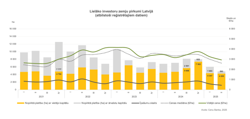 Salīdzinājumam – 2024. gadā kopējais lielāko investoru darījumu apjoms Latvijā (vietējais un ārvalstu kapitāls kopā) bija 30 149 ha (2977 darījumi), kas nozīmē, ka šis viens darījums pārspēj 2024.gada apjomu vairāk nekā četras reizes vai līdzvērtīgs 160% no visiem darījumiem ar zemēm Latvijā 2024.gadā.