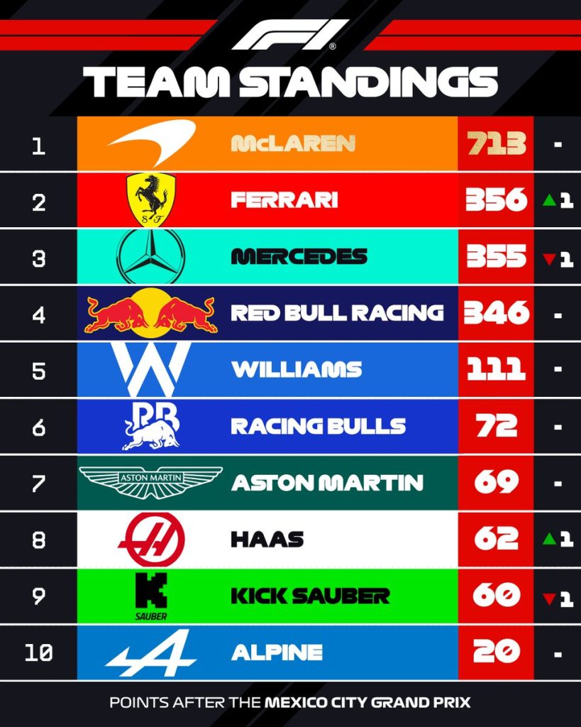 Tāpat ārkārtīgi spraiga cīņa notiek par otro līdz ceturto vietu starp “Ferrari”, “Mercedes”, kas pēc Mehiko GP zaudēja otro pozīciju, un “Red Bull”.