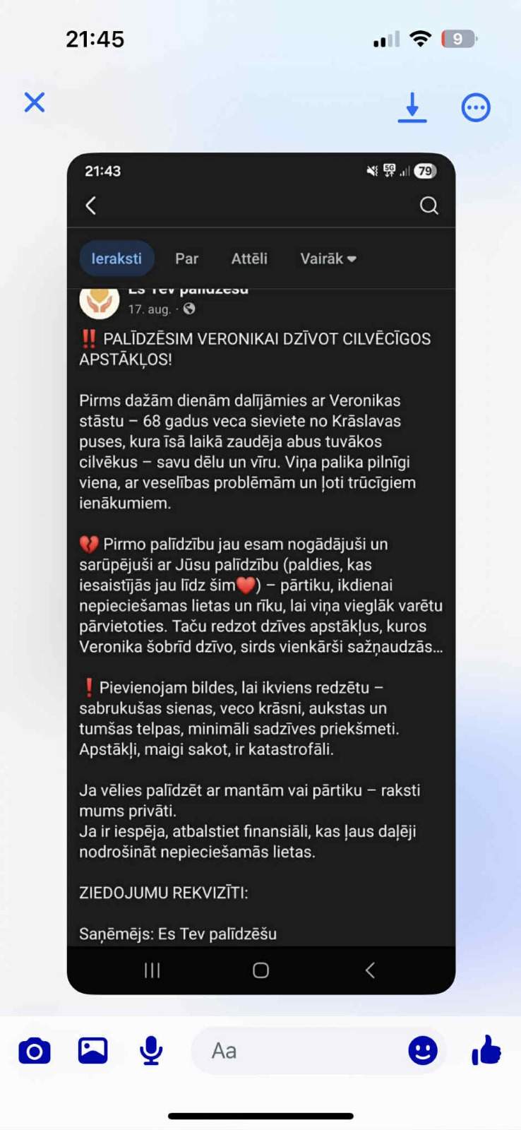 “Ļoti labi, ka esat izlēmuši beigt savu pastāvēšanu! Par jūsu krāpnieciskajām darbībām jau sen cilvēki sūdzas! Izdomāti žēlabaini stāstiņi un bildes uzģenerētas ar mākslīgo intelektu, nevienas atskaites, nevienas bildes, ka cilvēkiem patiešām reāli tiek piegādāta palīdzība, komentāri vienmēr visos ziedojumu lūgumu postos ir atslēgti (!) – tas arī jau ir ļoti nopietns signāls, ka jūs baidāties, ka cilvēki komentāros stāstīs patieso situāciju. Ielieciet patiesos ciparus, cik jums ir saziedots, skrīnšotu no bankas konta! Tur tik atklāsies, ka saziedots ir simtkārt vairāk, nekā jūs esat te piekabinājuši feika lapelē te komentāros klāt. Cilvēki dalījās tūkstošiem ar jūsu postiem, un ziedoja jums nenormālas summas! Jums pašiem nav kauns nodarboties ar krāpniecību?”