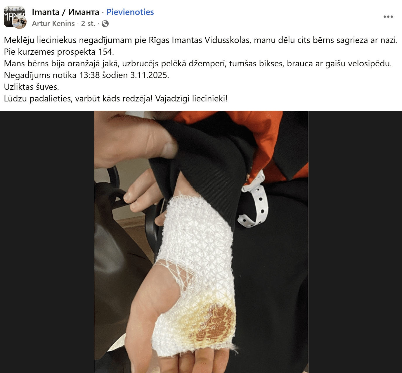Tēvs vēršas pie sabiedrības ar “Facebook” lapas “Imanta/Иманта” starpniecību: “Meklēju lieciniekus negadījumam pie Rīgas Imantas Vidusskolas, manu dēlu cits bērns sagrieza ar nazi. Pie Kurzemes prospekta 154.
