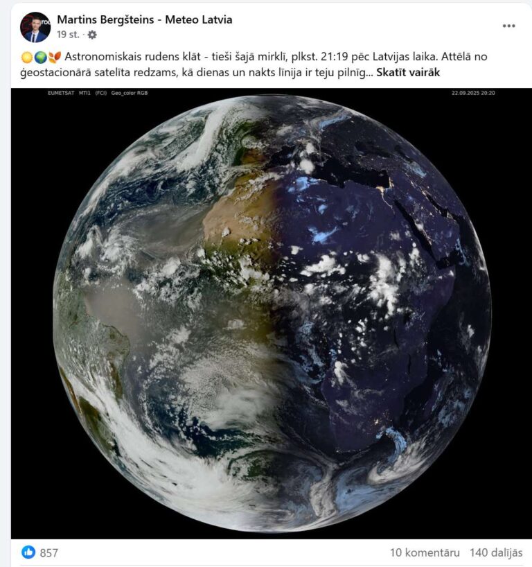 Martins sociālajos tīklos publicējis unikālu attēlu, kas uzņemts no satelīta. Viņš pie šīs fotogrāfijas raksta šādu komentāru: “Astronomiskais rudens ir klāt – tieši šajā mirklī, plkst. 21:19 pēc Latvijas laika. Attēlā no ģeostacionārā satelīta redzams, kā dienas un nakts līnija ir teju pilnīgi vertikāla.” Bet ko tas īsti nozīmē?