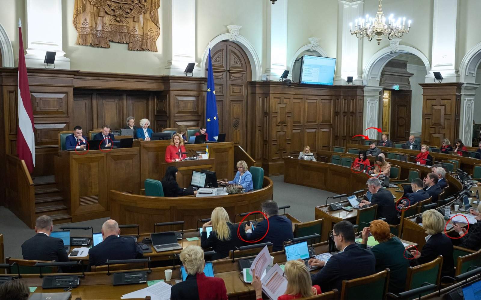 Telefoni daudziem šķiet aizraujošāki par Ministru prezidentes teikto, visticamāk, par “maz svarīgo” budžeta tēmu. Daudzi skatās arī datoros, iespējams, ka lasa plašāku informāciju saistībā ar aktuālajām tēmām. To nezinām.