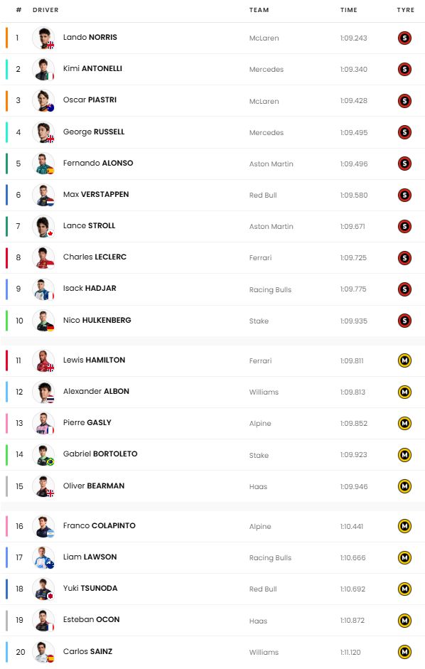 Noriss pēdējo apli veica vēl mazliet ātrāk kā iepriekš un ar rezultātu 1:09.243 izcīnīja pirmo starta vietu. Antonelli atpalika 0.097 sekundes un nodrošināja sev otro starta pozīciju uz sprintu, savukārt Piastri pārspēja Raselu cīņā par trešo vietu. Piektajā vietā kvalificējies Alonso, bet Makss Verstapens, neskatoties uz rekordu pirmajā trases sektorā, beigās palika sestais. Lānss Strols tika līdz septītajai vietai, aiz sevis atstājot Leklēru, Īzaku Hadžāru un Niko Hilkenbergu.