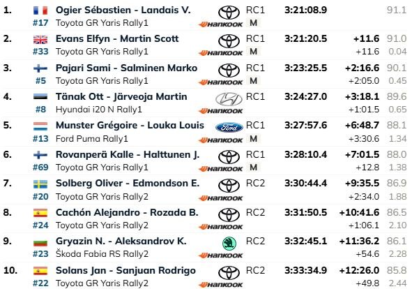 Sestdien Evanss vienubrīd bija pietuvojies Ožjē līdz 1.4 sekunžu atstatumam, tomēr dienu astoņkārtējais WRC čempions noslēdza jau 6.5 sekundes priekšā. Svētdien bija atlikuši seši ātrumposmi, četros no tiem Ožjē uzrādīja labākos rezultātus, ieskaitot noslēdzošo “Power Stage”, kas neļāva sāncensim pietuvoties. Finišā Ožjē iebrauca ar 11.6 sekunžu pārsvaru un guva jau sesto uzvaru šosezon pēc neveiksmīgā Centrāleiropas rallija, kur nācās izstāties.