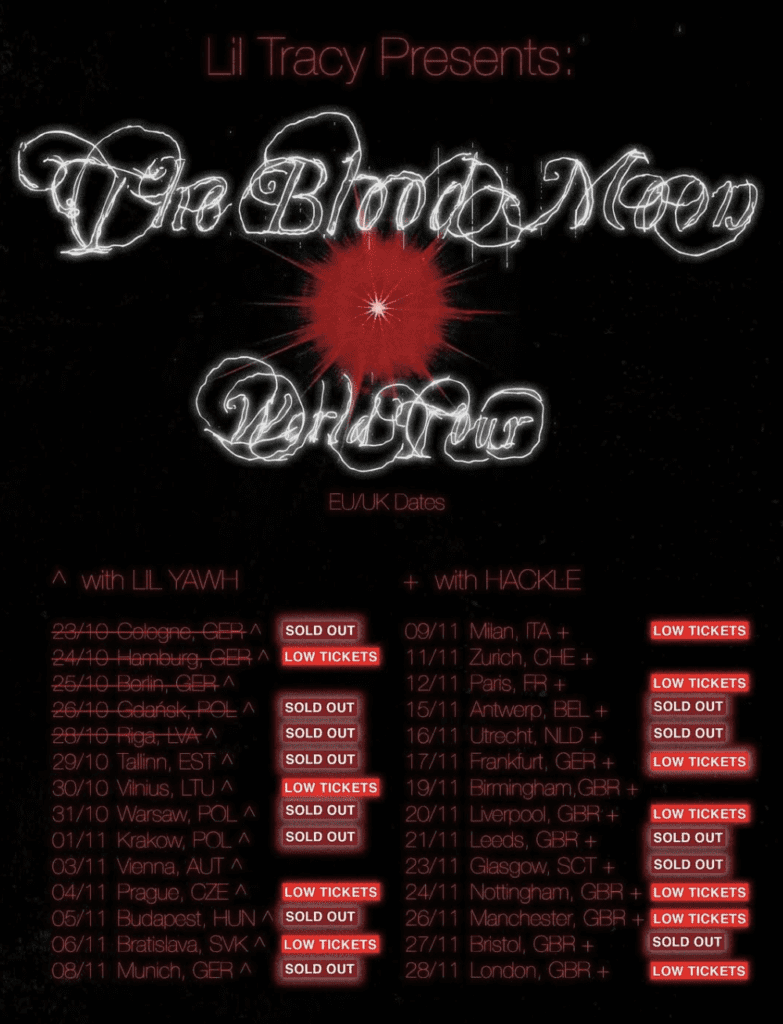 Koncerta afišā tika reklamēts, ka Lil Tracy iesildīs GothBoiClique mākslinieks Cold Hart, bet viņš diemžēl netika uz Eiropas koncerttūri saistībā ar bērna piedzimšanu. Parunājot ar tūres komandu pie turnejas kreklu stenda, uzzinājām arī to, ka lielākā daļa komandas (ieskaitot Lil Tracy) koncerta dienā bija saslimuši.