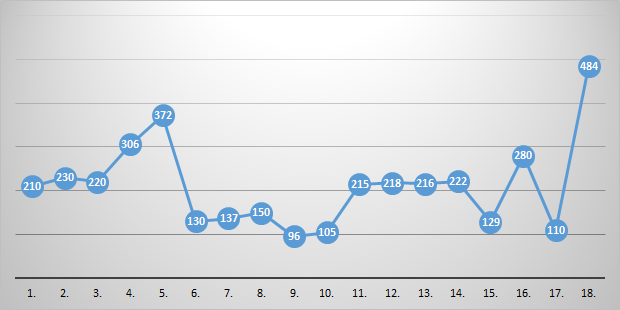 Vidējais vārtu skaits: 1.08 iesisti, 2.06 ielaisti, 3.14 kopā (vidēji čempionātā 1.48:1.48, kopā 2.97).