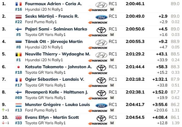 Tikmēr dramatisks pavērsiens noticis cīņā par titulu. Elfins Evanss sacensību 11. ātrumposmā jau sākumā bija spiests apstāties, lai nomainītu riepu un zaudēja vairāk par divām minūtēm. Pirms tam viņš ieņēma devīto vietu sacensību kopvērtējumā, bet tagad ir desmitais. Sebastjēns Ožjē pašlaik septītais, bet Kalle Rovanpera – astotais. Arī Rovanpera SS11 pārsita riepu, taču tas notika netālu pirms finiša un daudz laika nenācās zaudēt.