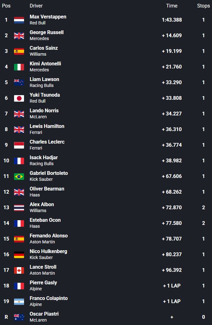 Četrkārtējais F1 čempions finišēja 14.6 sekundes priekšā Raselam un izcīnīja ceturto uzvaru šosezon, kā arī otro pēc kārtas. Sainss ar trešo vietu nodrošināja sev pirmo pjedestālu kopš pievienošanās “Williams”, bet komandai tas ir pirmais “Top 3” rezultāts kopš skandalozās Beļģijas GP sacīkstes 2021. gadā, ko lietus dēļ apturēja jau trešajā aplī. Antonelli nebija tālu aiz Sainsa un finišu sasniedza ceturtais.