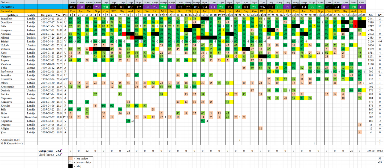 Vec. – vecums jeb pilnie gadi sezonas beigās. P – pozīcija (V – vārtsargs, A – aizsargs, P – pussargs, U – uzbrucējs). Min. – kopā nospēlētās minūtes. Sāk. – spēļu skaits sākumsastāvā. Dz.k. – dzeltenās kartītes. Sark. – sarkanās kartītes.