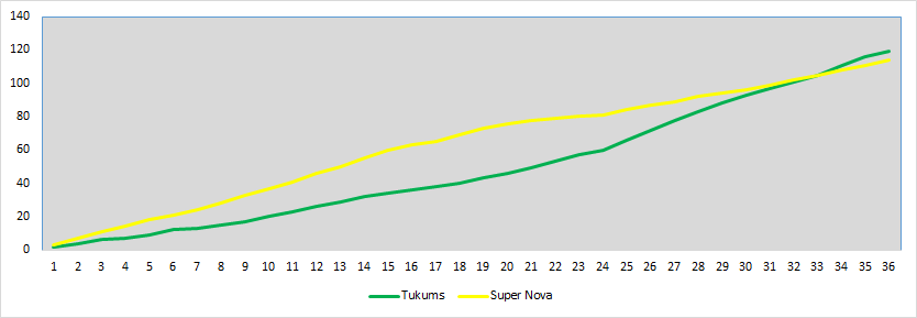Tiesa, vienlaikus jāatceras, ka arī šogad Tukuma vienība bija relatīvi jauna un tajā nebija neviena 30+ gadu veca spēlētāja – pērn vecākais ar 25 gadiem bija Mihubī, šogad Atsuši Kurokava, kam 27. Pavisam jauno skaits gan saruka un, svarīgi, arī spēles laika ziņā. Sezonas beigās jaunāki par 20 bija Ķere (17), Helvijs Joksts, Rems Gastons Dzeguze (abiem 18) un Daniils Putrāns (19).