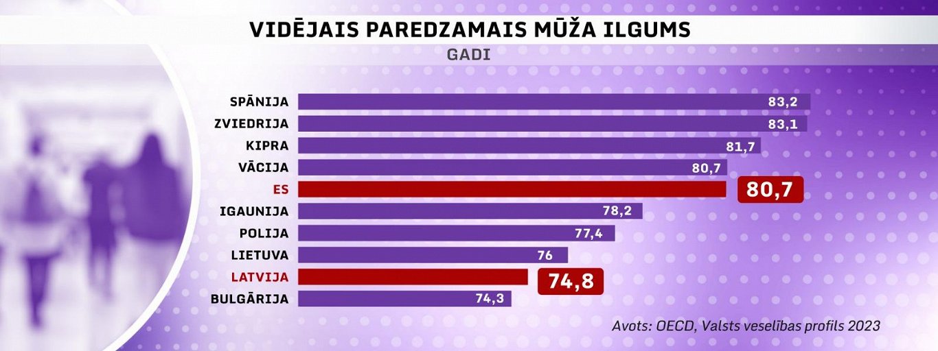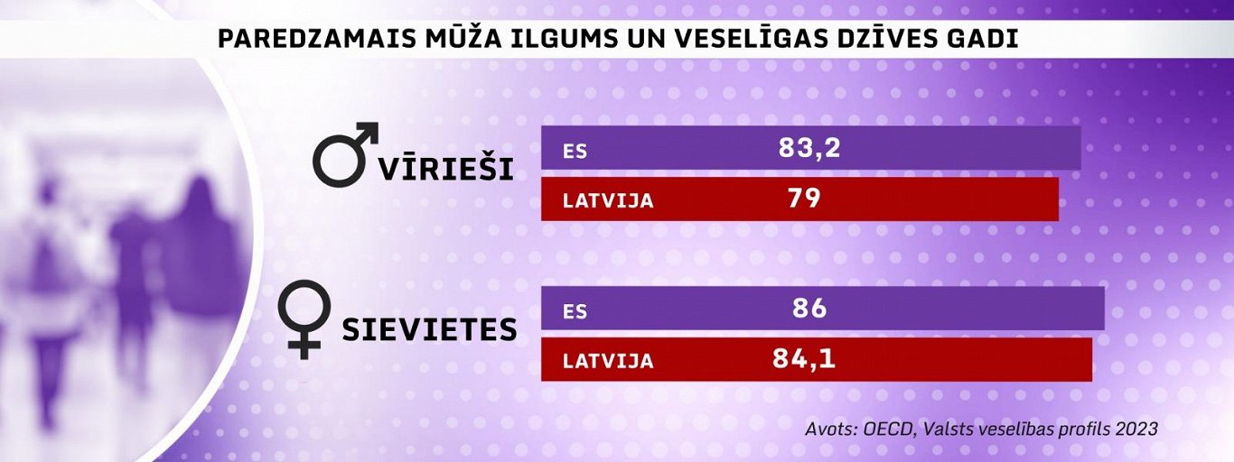 OECD analīzē secināts, ka Latvijā vidējais paredzamais mūža ilgums ir viens no zemākajiem Eiropas Savienībā – tas ir par pieciem gadiem mazāks nekā vidējais rādītājs.