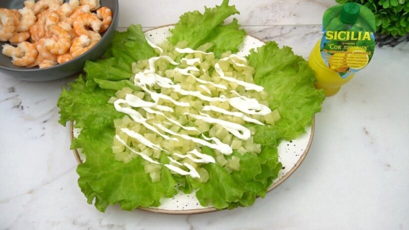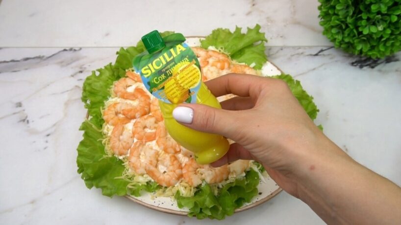 Otrajā kārtā dējiet olas, apsmērējiet ar majonēzi, smalki sarīvējiet 100 gramus siera un trešajā kārtā apsmērējiet ar majonēzi. Virsū uzlieciet garneles un dekorējiet ar dillēm. Aplejiet ar citronu sulu. Salāti ir gatavi, pasniedziet. Labu apetīti!