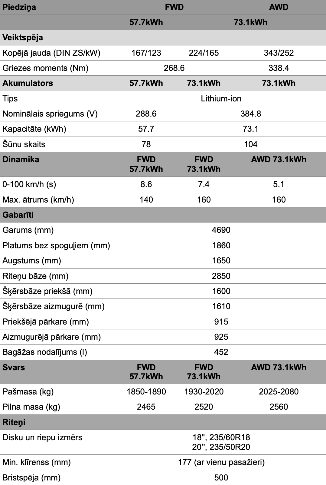 Spānijā sabraukušajiem mediju pārstāvjiem bija iespēja praksē iepazīt 224 zirgspēku priekšpiedziņas un 343 zirgspēku pilnpiedziņas modeli. Galvenās atziņas ir tādas, ka priekšpiedziņas automobilis ir saprātīga izvēle tiem, kam nav sevišķu dinamisku ambīciju, bet ir vajadzība ar vienu uzlādi veikt lielus attālumus. Balstiekārta ir sportiski stingra, taču asos pagriezienos ir jūtams, ka lielāks svars gulst uz priekšējo asi – tātad pie lielāka ātruma var būt jūtama nepietiekama pagriežamība. Rimtai ikdienas braukšanai gan tas pilnīgi netraucē. Pilnpiedziņas modelī izsvarojums ir labāks, tuvu 50:50, dinamika ir graujoši pārāka un sniedzamība nemaz nav tik ļoti mazāka. Nu, ja izvēlas pieticīgos bāzes 18 collu riteņus.