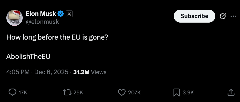Aizvadītajā nedēļā Eiropas Komisija (EK) paziņoja, ka Īlona Maska mikroblogošanas vietnei “X” piemēro 120 miljonu eiro sodu par Digitālo pakalpojumu likuma pārkāpumiem. EK uzskata, ka zilā verifikācijas ķekša sistēma esot maldinoša, jo apgrūtina atšķirt īstus kontus no maldinošiem un palielina krāpšanas risku. Masks atbildi parādā nepalika un paziņoja, ka tās esot muļķības un Eiropas Savienībai (ES) jābeidz pastāvēt. Arī pēdējās dienās Masks publicējis vairākus ierakstus, kuros asi kritizē ES.
