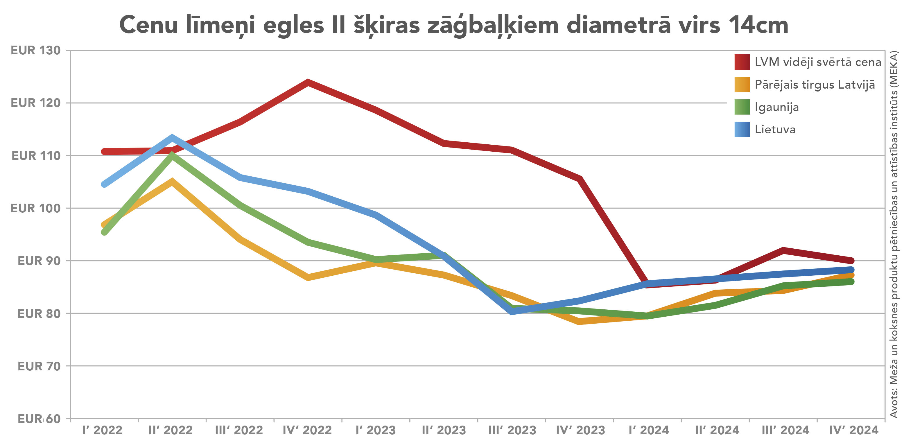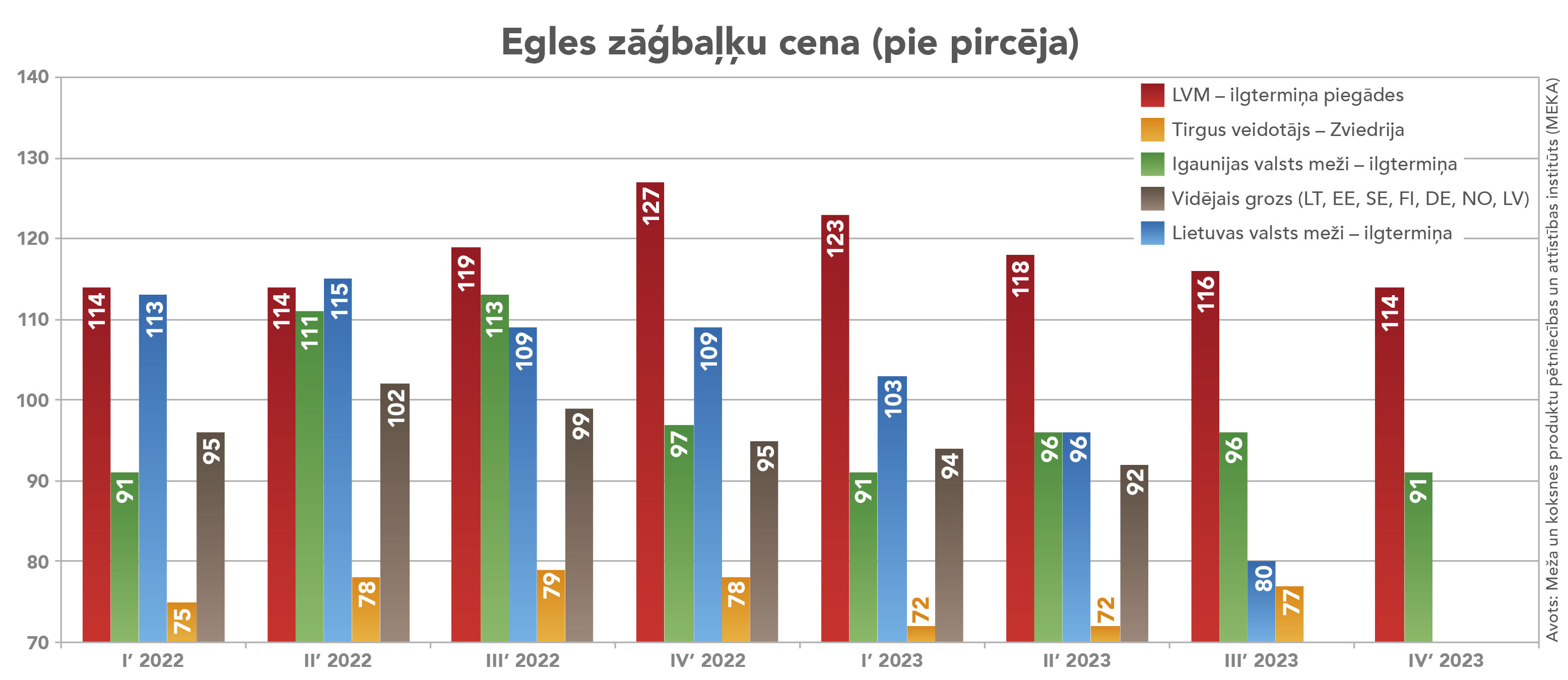 Tikai daži skaitļi. 2022. gada ceturtajā ceturksnī egles zāģbaļķu cena pie pircēja Latvijā no LVM bija 127 eiro/m³, no Lietuvas valsts mežiem 109 eiro/m³, no Igaunijas valsts mežiem – 91 eiro/m³, bet Zviedrijā, kas būtībā ir šī tirgus veidotājs – 78 eiro/m³, 2023. gada II ceturksnī egles zāģbaļķu cena pie pircēja Latvijā no LVM bija 118 eiro/m³, no Lietuvas valsts mežiem 96 eiro/m³, no Igaunijas valsts mežiem – 96 eiro/m³, bet Zviedrijā – 72 eiro/m³.