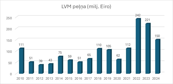 Šis apgalvojums nav patiess, jo skaitļi rāda ko citu. Proti, valsts budžeta likums paredzēja, ka valsts mežu apsaimniekotājs (LVM) valsts budžetā dividendēs par 2024. gadu iemaksā ne mazāk kā 58,574 miljonus eiro, faktiski uzņēmums samaksāja nedaudz vairāk kā 111 miljonus eiro, tātad par 52,9 miljoniem eiro vairāk nekā sākotnēji tika prognozēts. LVM plānotās peļņas – 90 milj. eiro – vietā ieguva 150 milj. eiro. Vai tas ir daudz, vai maz? Laikā no 2011. līdz 2021. gadam LVM peļņa vidēji bija ap 70 milj. eiro gadā, vienlaikus nozare veica nozīmīgas investīcijas un dubultoja pievienoto vērtību. 2021. gadā LVM gūst līdz tam brīdim vislielāko peļņu – 112 milj. eiro, savukārt skujokuku zāģētās produkcijas ražotāji – 178 milj. eiro. Kāpēc 2021. ir īpašs gads?! Tas ir Covid-19 pandēmijas “pīķa” brīdis ar visa veida liegumiem (daļa nozaru strādā ar milzīgiem ierobežojumiem, daļa ir slēgtas, cilvēkiem jādzīvo mājās, nav iespējami ceļojumi), un daudziem rodas liela vēlme un iespēja uzlabot dzīves apstākļus, kā rezultātā būvmateriālu cenas piedzīvo nepieredzētu kāpumu, piemēram, ASV līdz 300%, Lielbritānijā un citos Latvijas ražotājiem būtiskos noieta tirgos vērojams līdzīgs pieaugums.