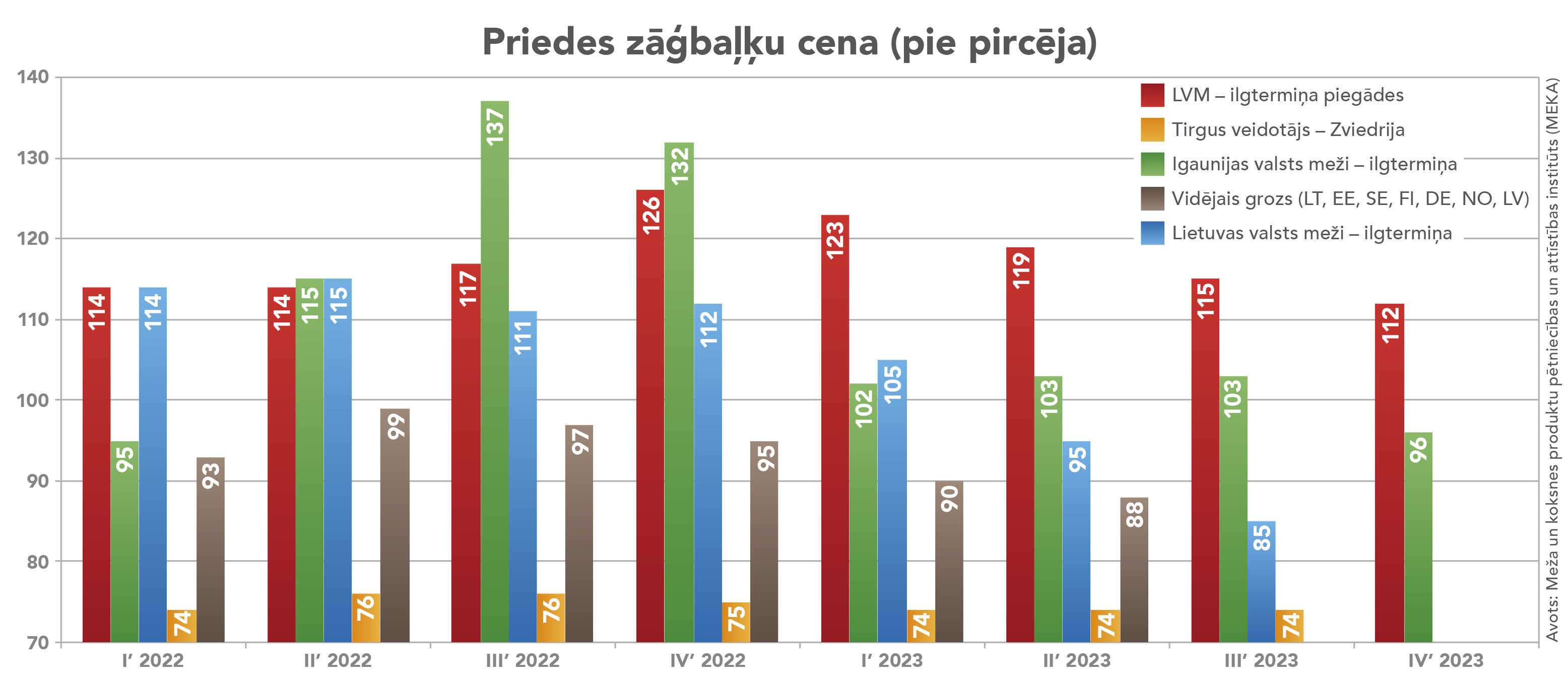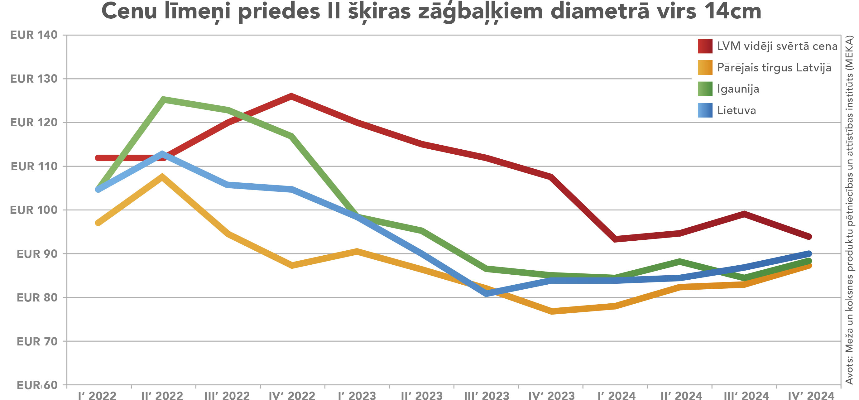 Savukārt 2022. gada IV ceturksnī priedes zāģbaļķu cena pie pircēja Latvijā no LVM bija 126 eiro/m³, no Lietuvas valsts mežiem 112 eiro/m³, no Igaunijas valsts mežiem – 132 eiro/m³, bet Zviedrijā – 75 eiro/m³, 2023. gada II ceturksnī Latvijā no LVM bija 119 eiro/m³, no Lietuvas valsts mežiem 95 eiro/m³, no Igaunijas valsts mežiem – 103 eiro/m³, bet Zviedrijā – 74 eiro/m³.Īsāk sakot, no 2022. gada II ceturkšņa skujkoku zāģbaļķu piegāžu līgumi no ilgāka termiņa sadarbības programmas zaudēja konkurētspēju, jo bija ir par 40% dārgāki nekā galvenajā konkurentvalstī – Zviedrijā. Skujoku pārstrādātāji Latvijā nevarēja klusēt un neko nedarīt, tāpēc jau 2023. gada oktobrī tika rakstītas vēstules, skaidrojot problēmu un aicinot meklēt risinājumu.