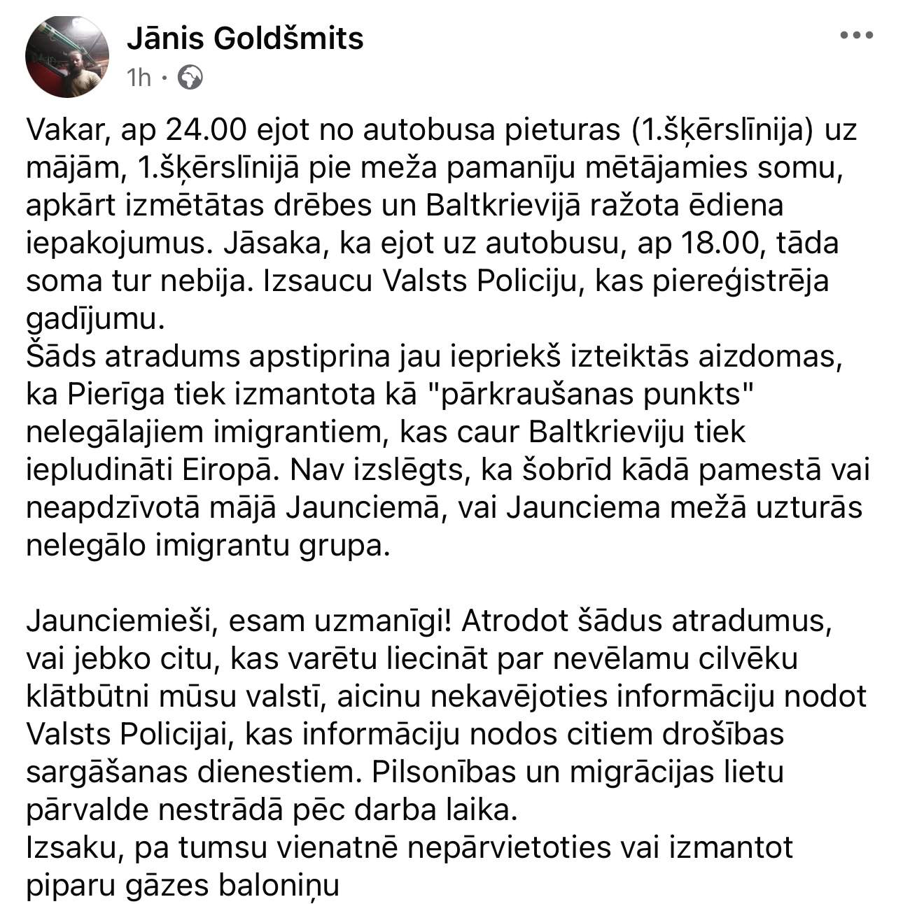 Viņš uzskata, ka šāds atradums apstiprina aizdomas, ka Pierīga dažkārt tiek izmantota kā “pārkraušanas punkts” nelegāliem imigrantiem, kuri caur Baltkrieviju nonāk Eiropā. Jānis neizslēdz, ka kādā pamestā mājā vai meža teritorijā Jaunciemā var uzturēties nelegālo imigrantu grupa.