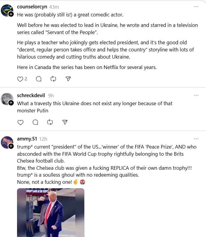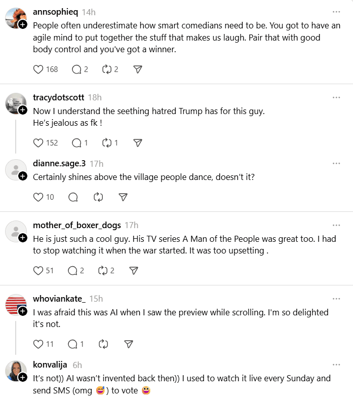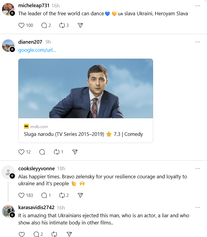 “Viņš bija (un, iespējams, joprojām ir!) lielisks komiķis un aktieris. Ilgi pirms viņa ievēlēšanas par Ukrainas prezidentu viņš rakstīja un pats arī spēlēja galveno lomu televīzijas seriālā “Tautas kalps”. Tajā viņš atveido skolotāju, kurš jokojot kļūst par prezidentu – klasiska sižeta līnija par godīgu, vienkāršu cilvēku, kurš nonāk amatā un mēģina uzlabot valsts situāciju, pilna ar smieklīgām ainām un asiem, patiesiem komentāriem par Ukrainas realitāti. Šeit Kanādā šis seriāls jau vairākus gadus ir skatāms Netflix.”
