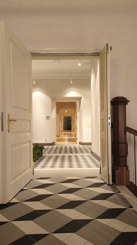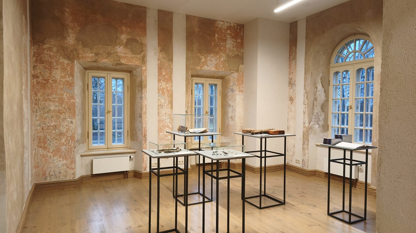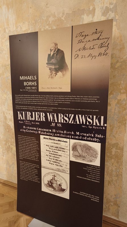 “Atjaunojot pili, mēs mēģinājām ļoti rūpīgi atrast tādas vietas, kas liecinātu par šo atsauci uz dekoratīvo krāsojumu, atstājām, lai parādītu mazo drusciņu no vēstures. Mēs esam telpā, kur ir šī brīnišķīgā ekspozīcijas siena, šeit var ieskatīties, kā pils izskatās iekšienē, pils ir būvēta no sarkaniem dedzinātiem māla ķieģeļiem, un šī siena ir speciāli atstāta, lai mēs varētu ielūkoties pils iekšienē. Rietumu tornī ir saglabājies visvairāk dekoru, logu dekori, kas ir šobrīd iekonservēti,” izrādīja Preiļu muižas kompleksa un parka vadītāja.