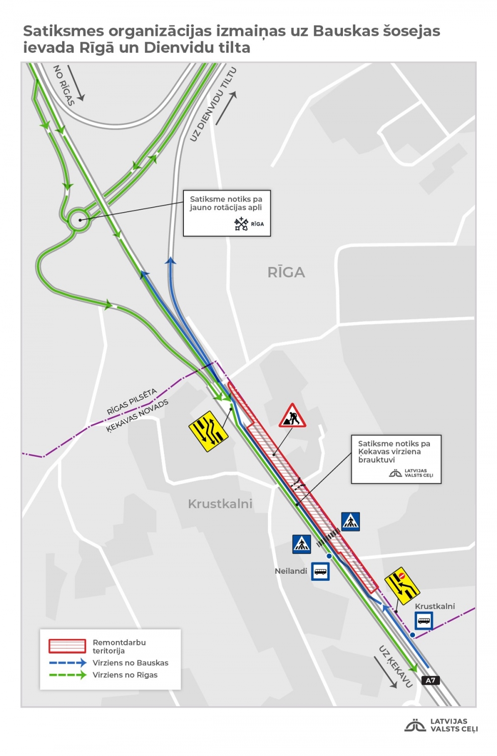 Trešdien satiksmes organizācija tur tiks mainīta un novirzīta uz Ķekavas virziena brauktuvi. Satiksme posmā no Dienvidu tilta un Ziepniekkalna ielas autosatiksmes plūsmu savienošanās vietas virzienā uz Ķekavu līdz izbūvētai tuneļa daļai organizēs pa trim joslām: pa divām izbraucot no Rīgas un pa vienu iebraucot Rīgā. Tas būs iespējams pateicoties tam, ka ir paplašināta brauktuve Bauskas virzienā. Pārējā būvdarbu zonā satiksme notiks pa vienu joslu katrā virzienā (sk. shēmu).