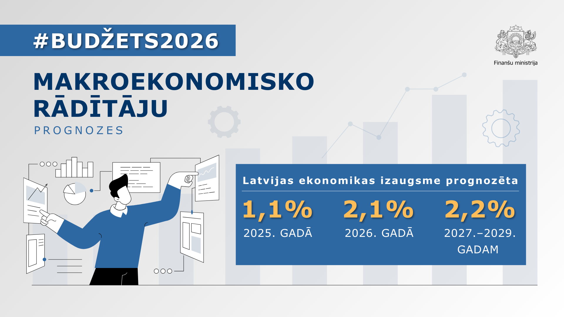 2026. gada valsts budžets veidots, balstoties uz piesardzīgām makroekonomiskajām prognozēm, kas izstrādātas šī gada jūnijā. Tās paredz mērenu ekonomikas izaugsmi un pakāpenisku inflācijas samazināšanos vidējā termiņā. Būtiskāko devumu ekonomikas izaugsmē šogad dod būvniecības, apstrādes rūpniecības un tirdzniecības nozares. Arī uzņēmumu kreditēšanas apjomi pēc vairāku gadu stagnācijas šogad ir sākuši spēcīgi pieaugt, un uzņēmumiem izsniegto kredītu portfelis augustā, salīdzinot ar 2024. gada augustu, ir audzis par 16%. Šā gada ekonomikas izaugsme tiek prognozēta 1,1% apmērā, savukārt nākamā gada budžeta ietvaros izaugsme plānota 2,1% apmērā, bet turpmākajos gados – līdz 2,2%.