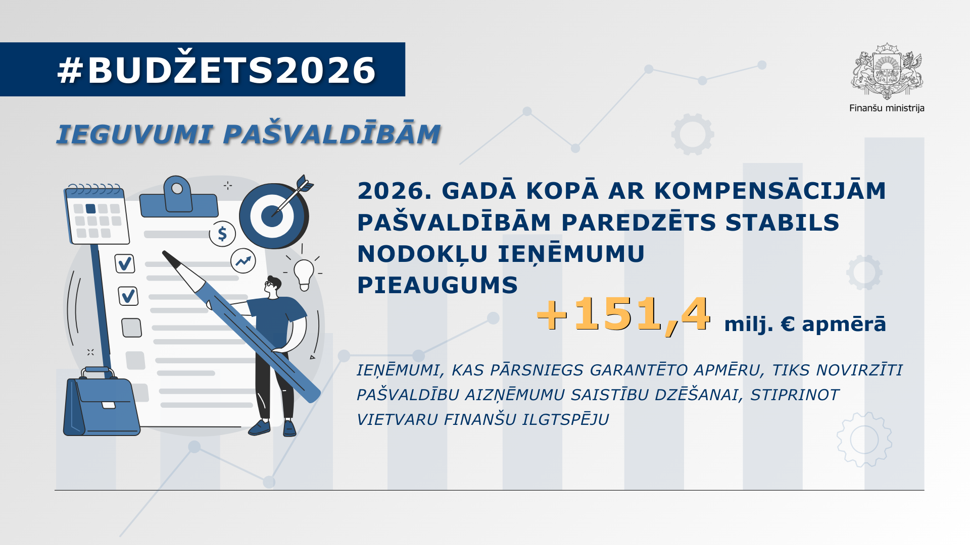 Pašvaldībām nākamajos gados prognozēts stabils nodokļu ieņēmumu kāpums – 2026. gadā kopā ar kompensāciju to pieaugums veidos 151,4 miljonus eiro jeb 6,1%. Garantēta arī iedzīvotāju ienākuma nodokļa prognoze pilnā apmērā, savukārt ieņēmumi, kas pārsniegs garantēto līmeni, tiks novirzīti aizņēmumu saistību dzēšanai, stiprinot vietvaru finanšu ilgtspēju un atbalstot sabalansētu reģionālo attīstību.
