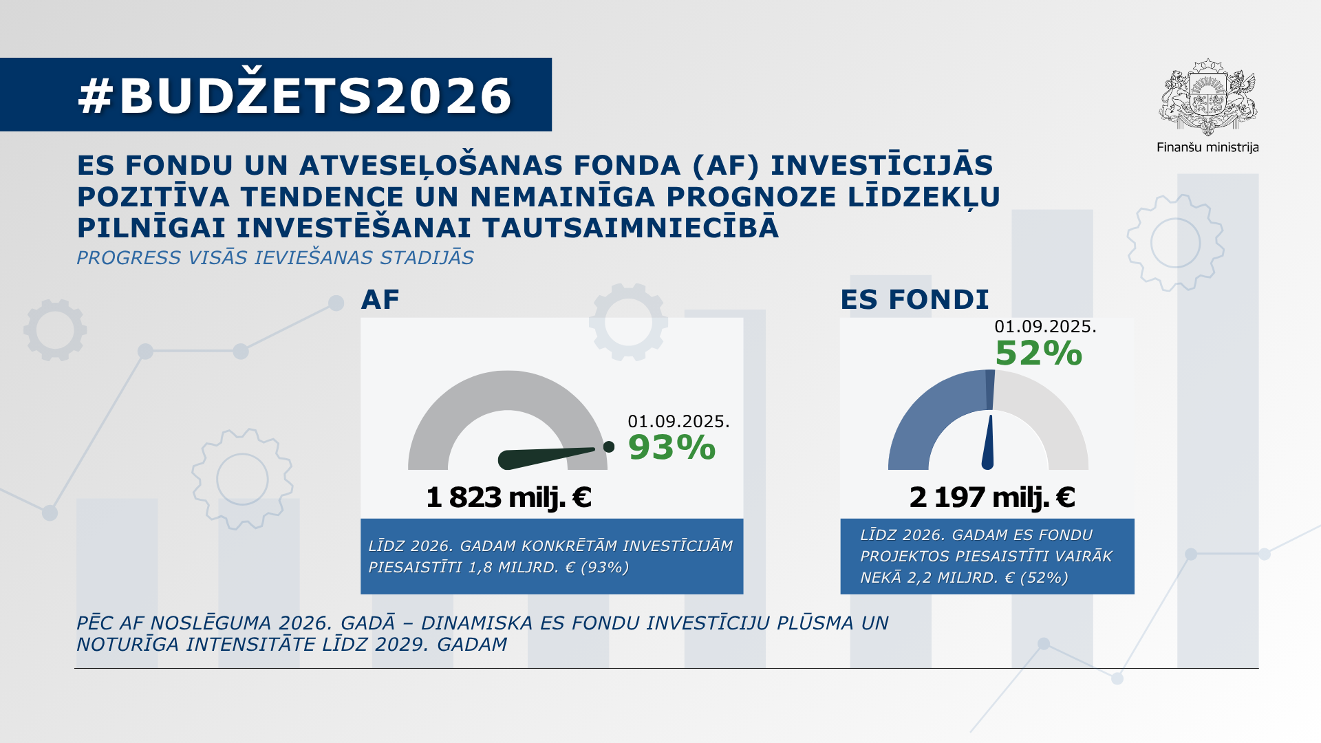 ES fondu un Atveseļošanas fonda investīcijas arī 2026. gadā būs viens no nozīmīgākajiem Latvijas ekonomikas izaugsmes virzītājiem, to apjomam pārsniedzot vienu miljardu eiro. Līdz 2026. gadam kohēzijas politikas ES fondu 2021.-2027. gada perioda projektos jau piesaistīti vairāk nekā 2,5 miljardi eiro īstenošanai līdz 2030. gadam. Savukārt 2026. gada rudenī noslēgsies Atveseļošanas fonda plāna reformu un investīciju īstenošana, par to izpildi nodrošinot visa pieejamā ES finansējuma 1,97 miljardu eiro saņemšanu valsts budžeta ieņēmumos.