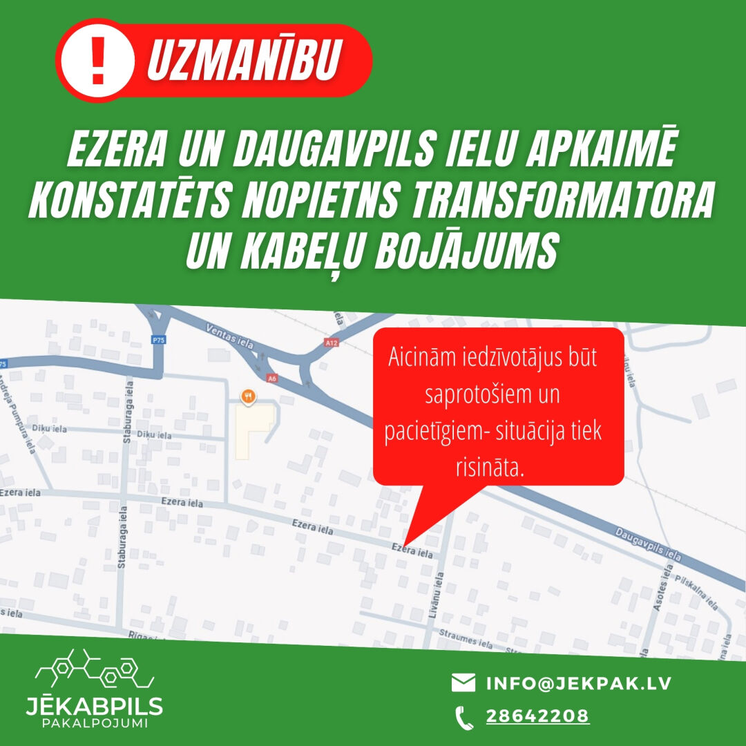 Jēkabpils pilsētā, Ezera un Daugavpils ielu apkaimē, konstatēts nopietns transformatora un kabeļu bojājums. Tas nozīmē, ka tuvākajās nedēļās šajā teritorijā nebūs iespējams nodrošināt ielu apgaismojumu.