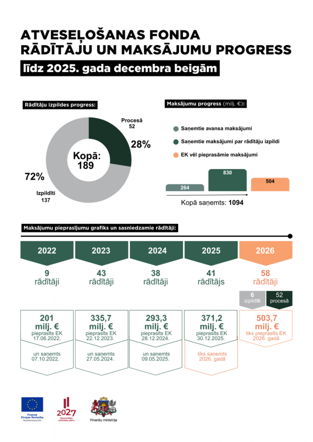 AF plāna ieviešana notiek ne vēlāk kā līdz 2026. gada septembrim, lai Latvija no EK saņemtu visu pieejamo 1,97 miljardu eiro piešķīrumu par reformu un investīciju īstenošanu. Līdz šim no EK saņemts vairāk nekā 1 miljards eiro jeb 55% no kopējā piešķīruma, tai skaitā par jau izpildītiem un ikgadējos maksājumu pieprasījumos iekļautajiem AF plāna rādītājiem. Līdz ar ceturtā EK maksājuma saņemšanu, kas indikatīvi paredzēts 2026. gada pirmajā pusē, Latvija būs kopā saņēmusi 1,47 miljardus eiro.
